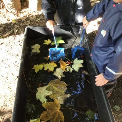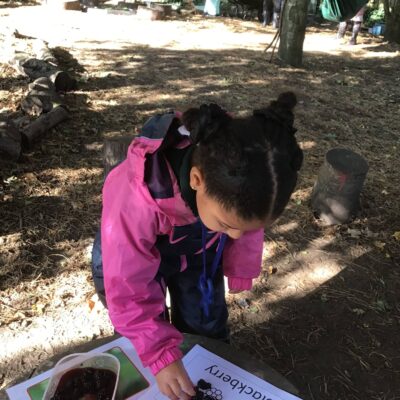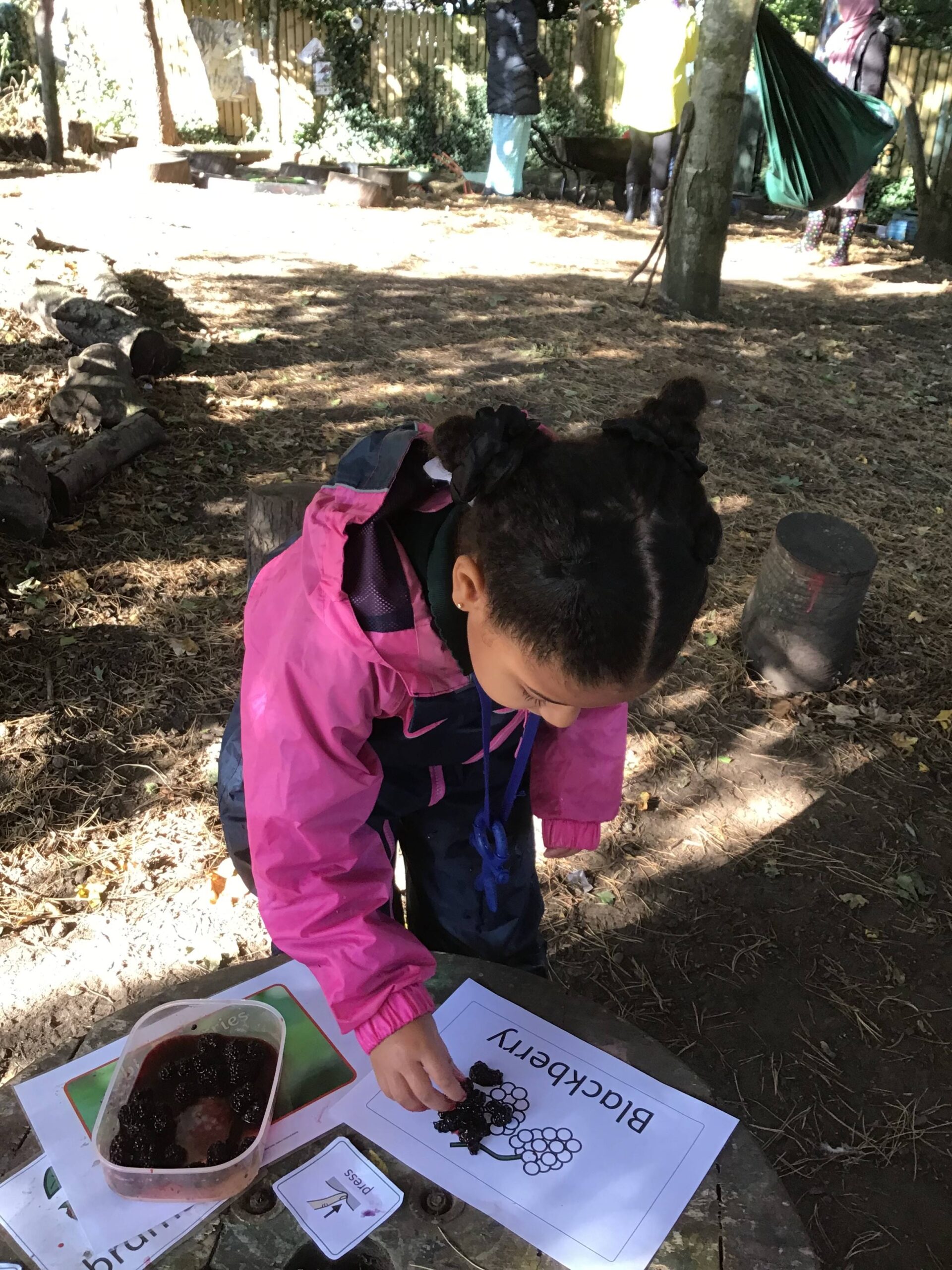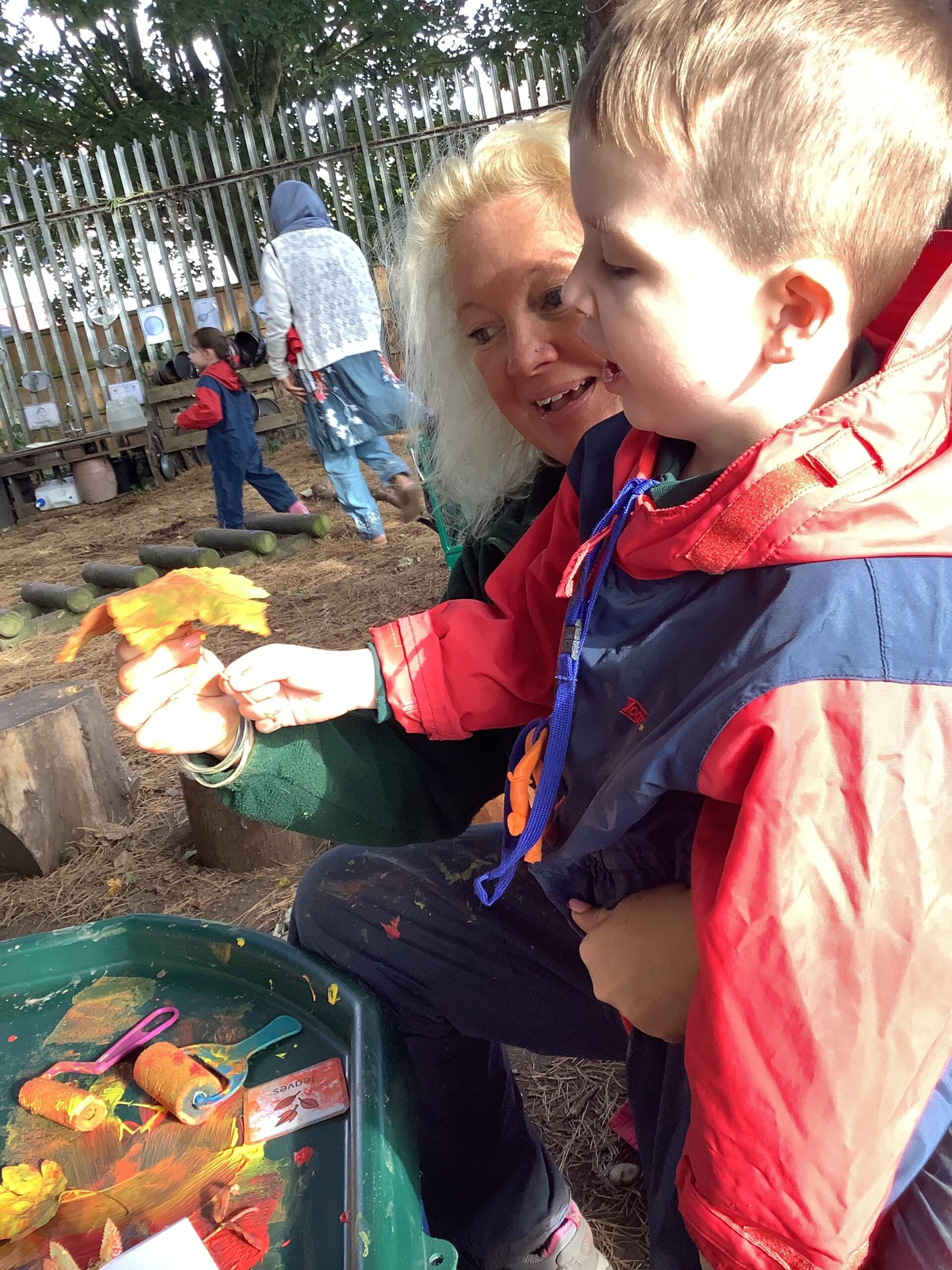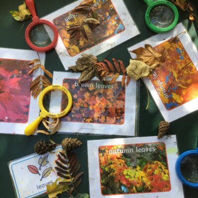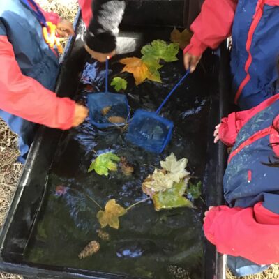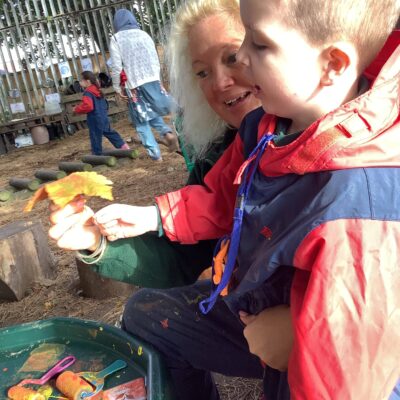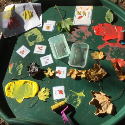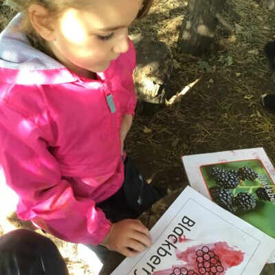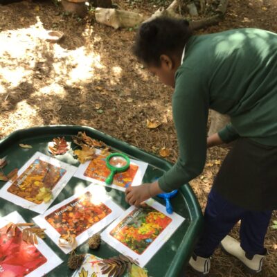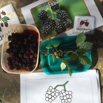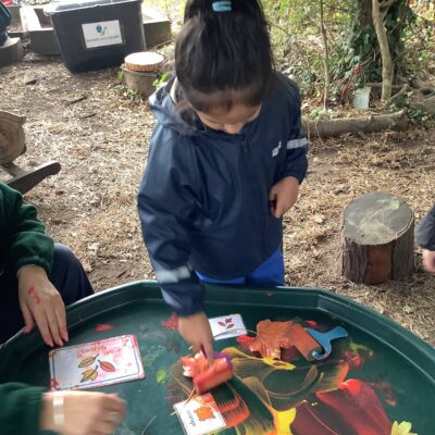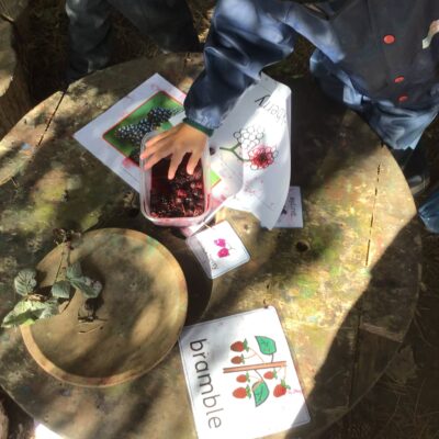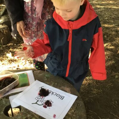 We have been celebrating the Autumn Equinox over the last two weeks. Classes have been looking at all the changing colours in the Forest at this time of year. We have looked at leaves, sorting them into colours and size, touching them, painting with them and have even gone fishing for them. Another exciting autumn activity using our senses has been mark making with Blackberries. The Blackberries made lovely purple marks as we squashed them, smelt sweet and tasted beautiful.