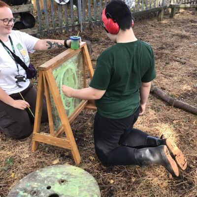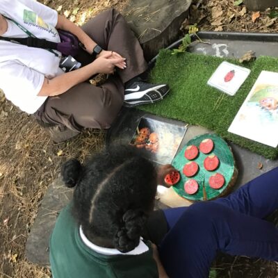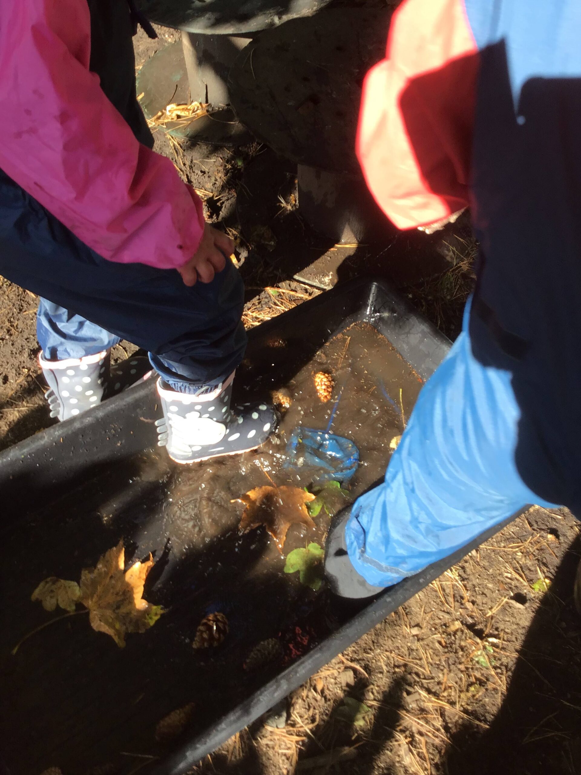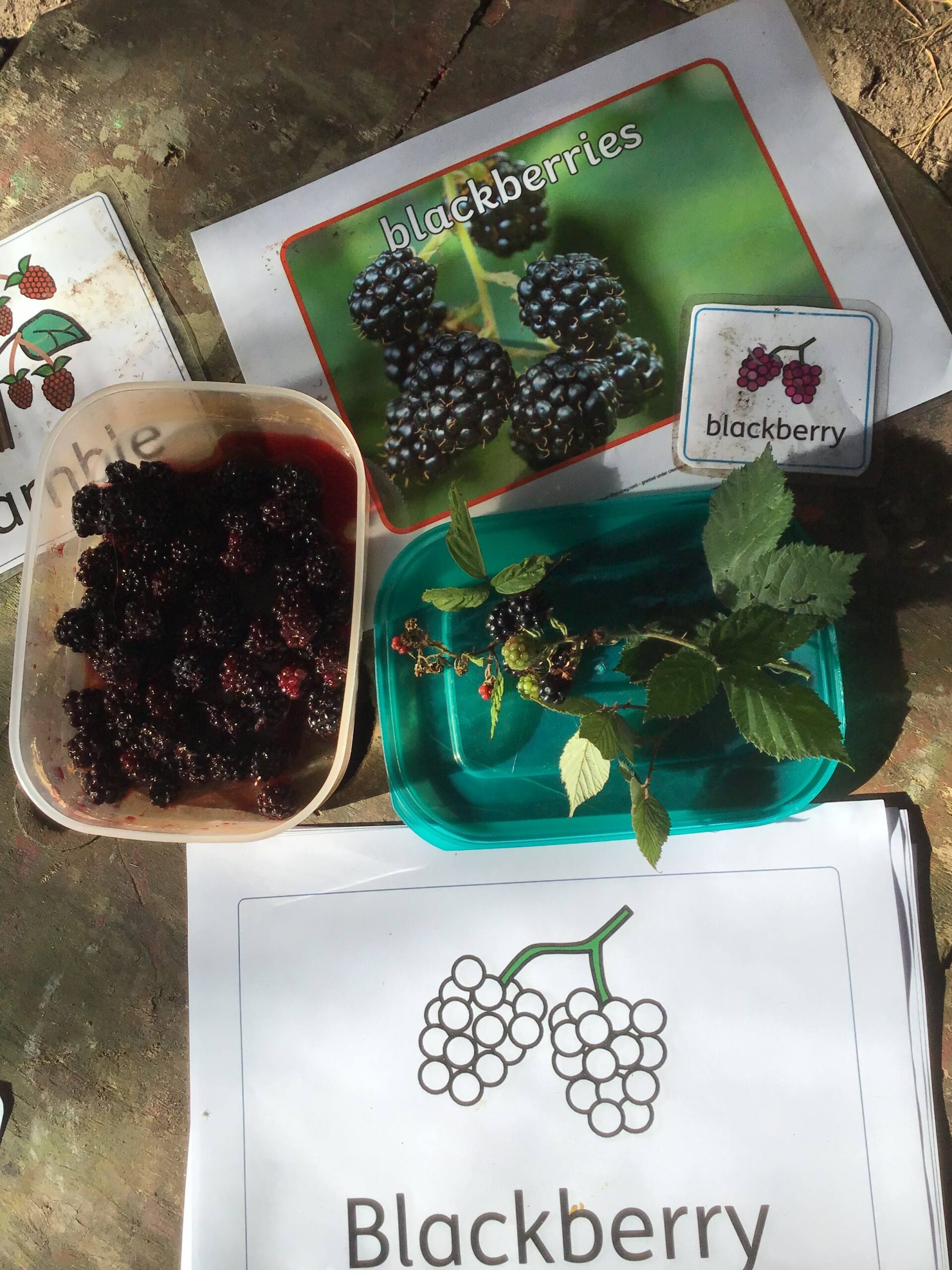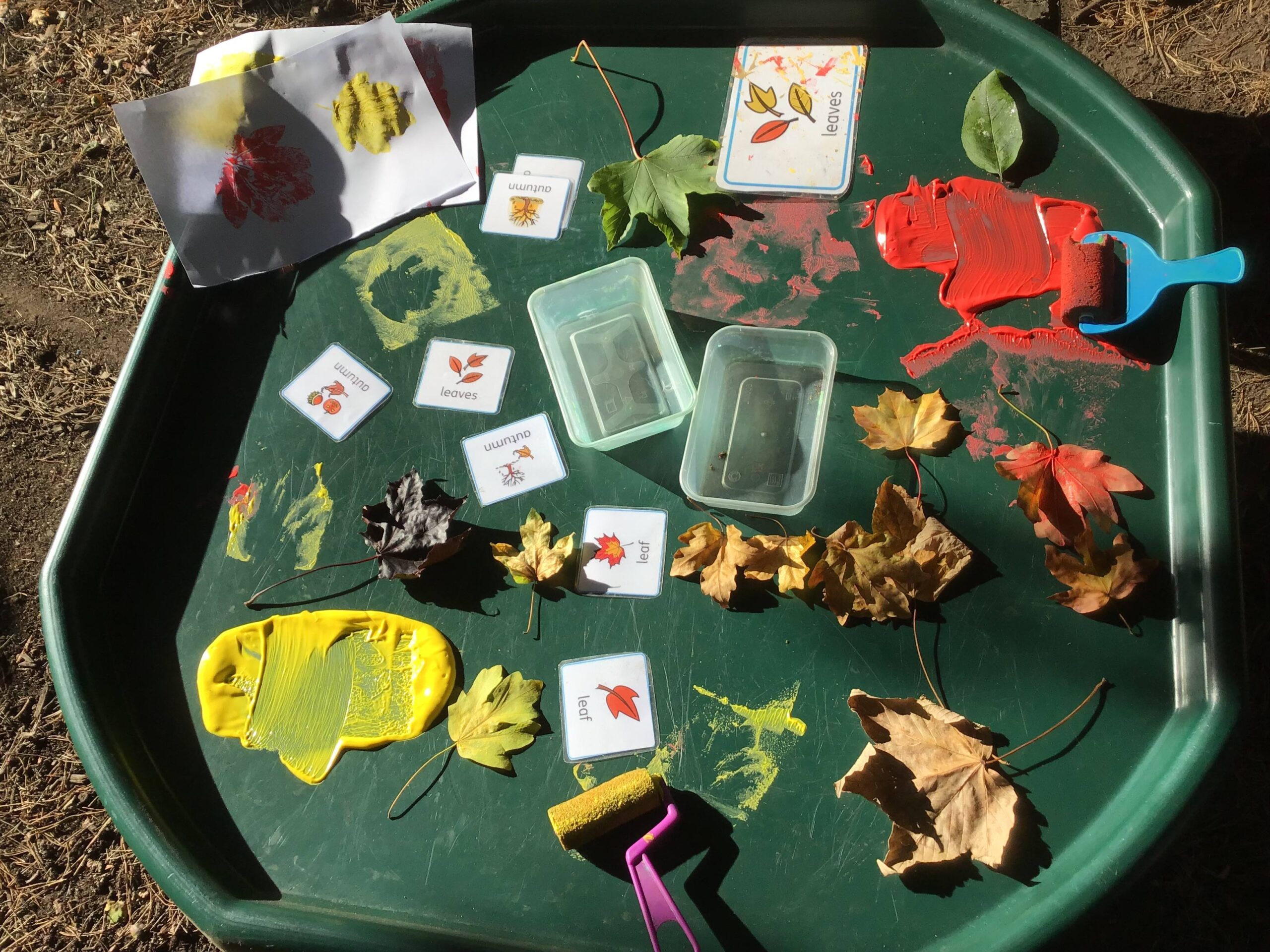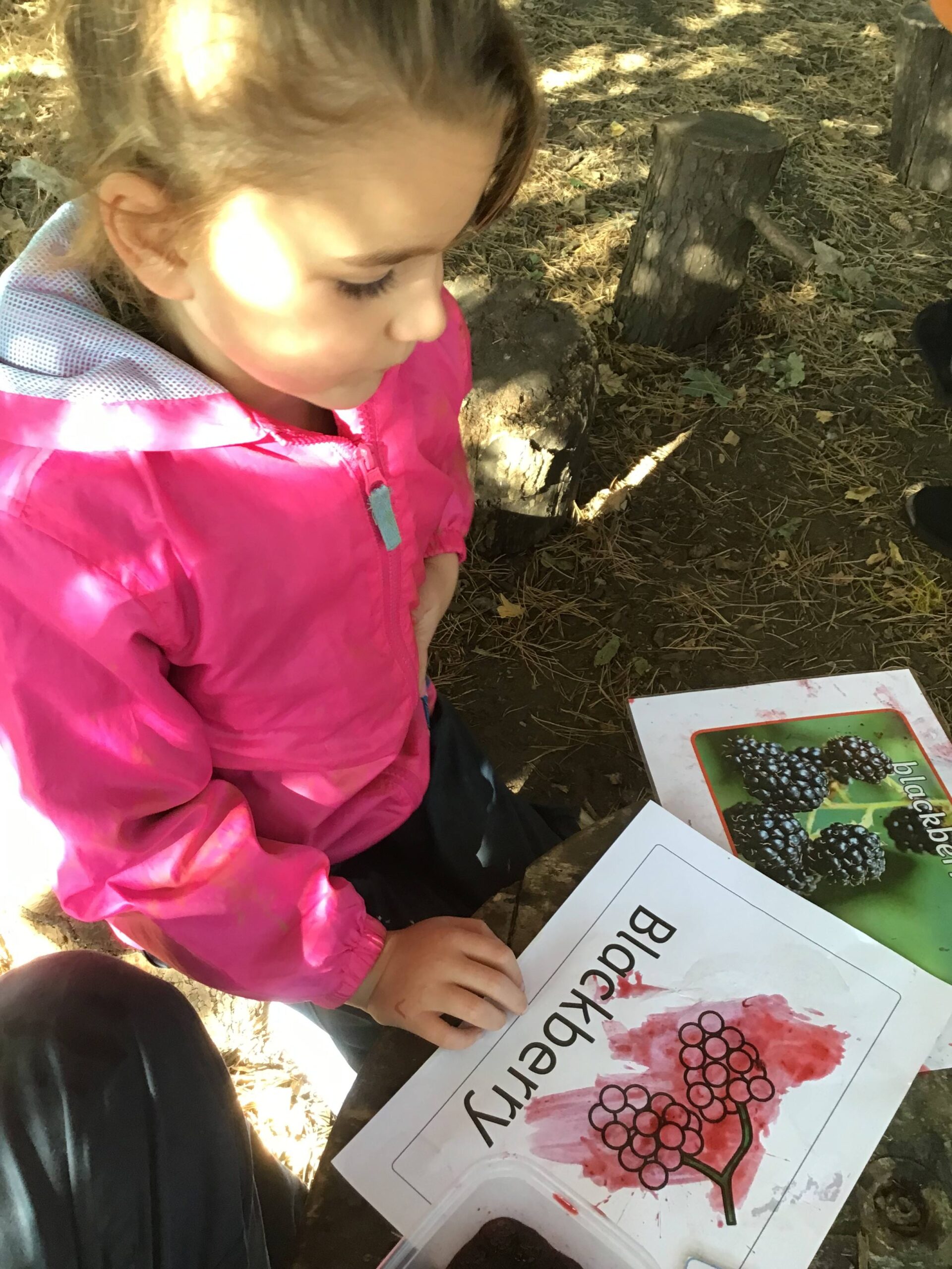 We have been celebrating the Autumn Equinox over the last two weeks. Classes have been looking at all the changing colours in the Forest at this time of year. We have looked at leaves, sorting them into colours and size, touching them, painting with them and have even gone fishing for them. Another exciting autumn activity using our senses has been mark making with Blackberries. The Blackberries made lovely purple marks as we squashed them, smelt sweet and tasted beautiful.
