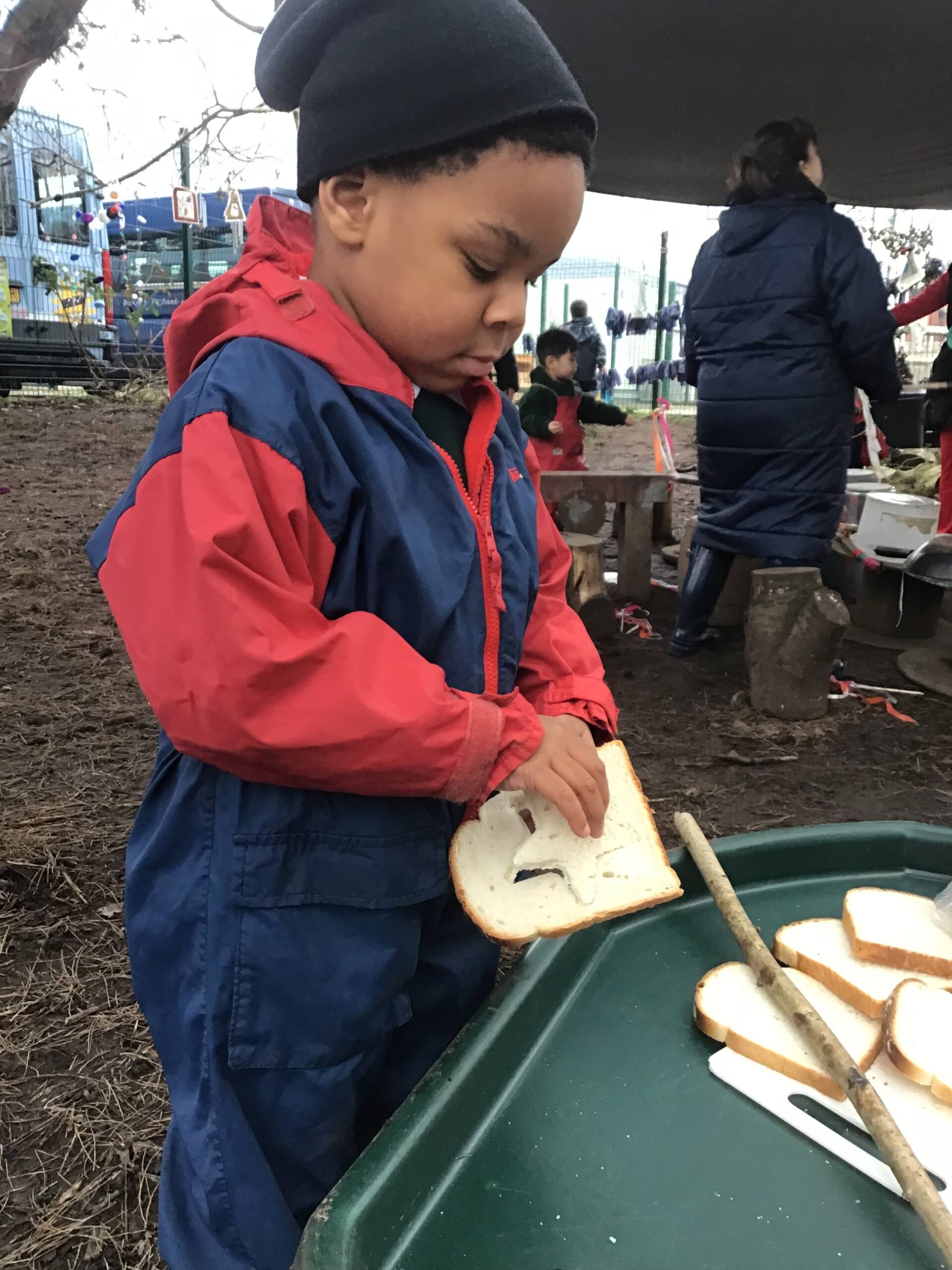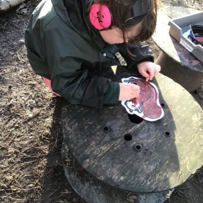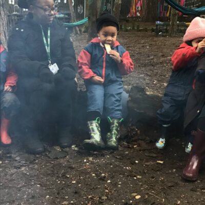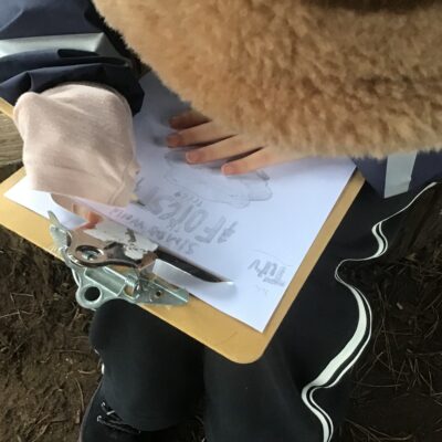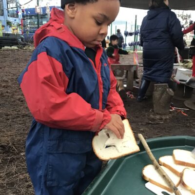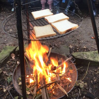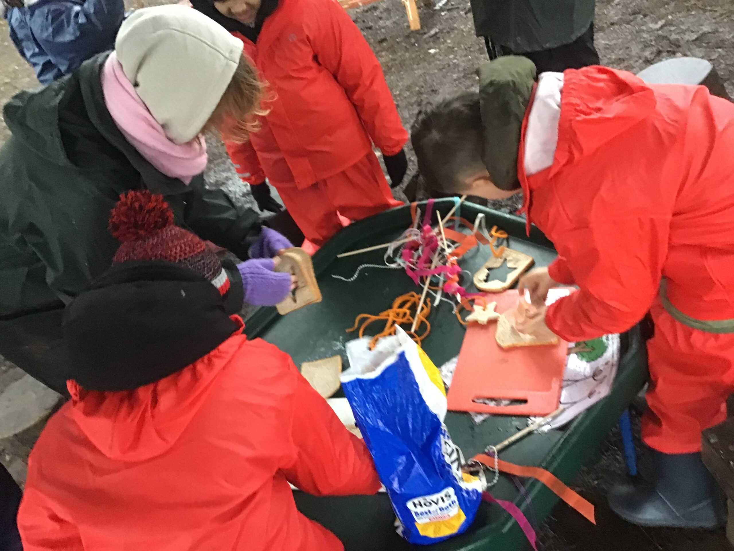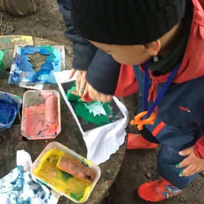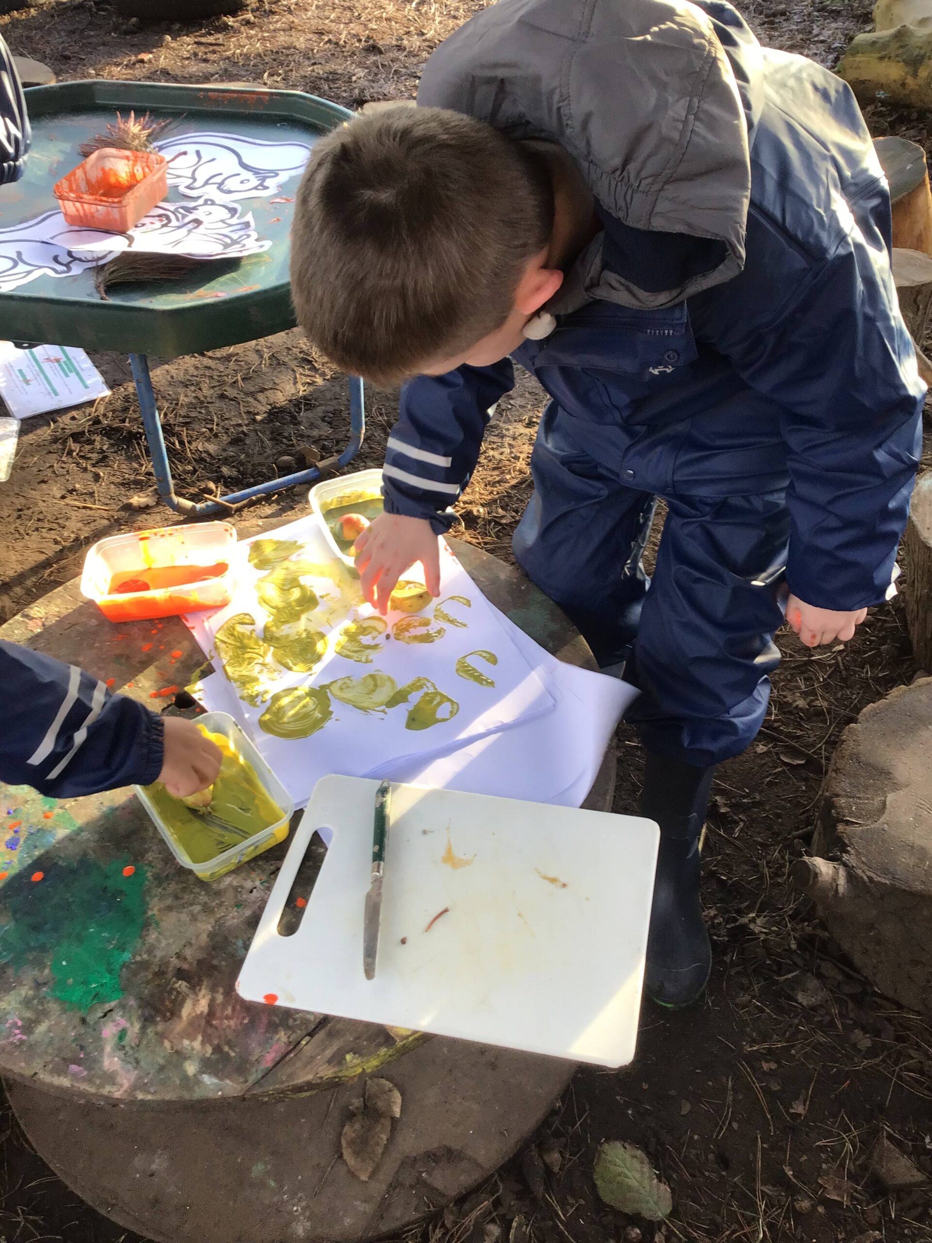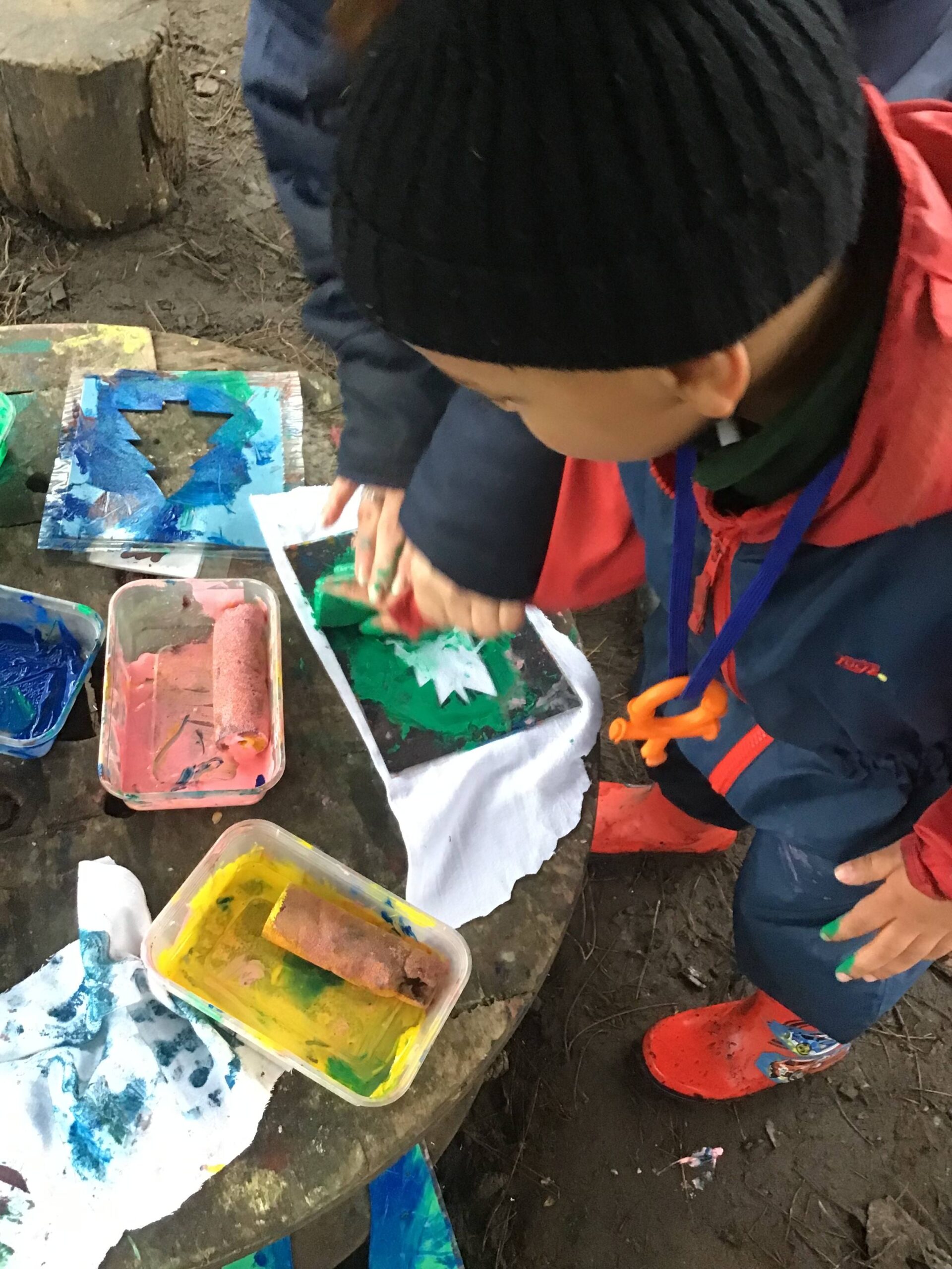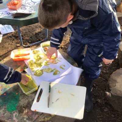 This week we also woke the Forest up by having our very own Pines ‘Wassail’ classes banged pots and pans to wake the trees and gave traditional offerings of bread. Early Years didn’t want the trees to have all the bread so toasted some on the campfire and enjoyed some hot buttered toast. Classes also used coloured paints to print new bunting to decorate the trees once they are awake. 2D made good use of the winter sun by producing brilliant solar pictures on cyantype paper while 2S enjoyed mark making in the mud while 2A decorated their own Oak tree.